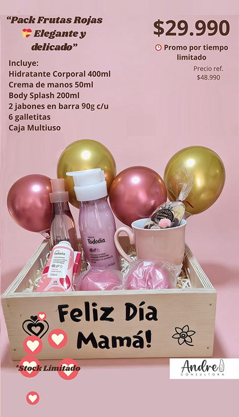 Elige el pack que mejor represente tu cariño a mamá y haz tu pedido vía WhatsApp al +56 9 5617 4792. Descuento por planilla, hasta tres cuotas precio contado, con despacho a tu sucursal.