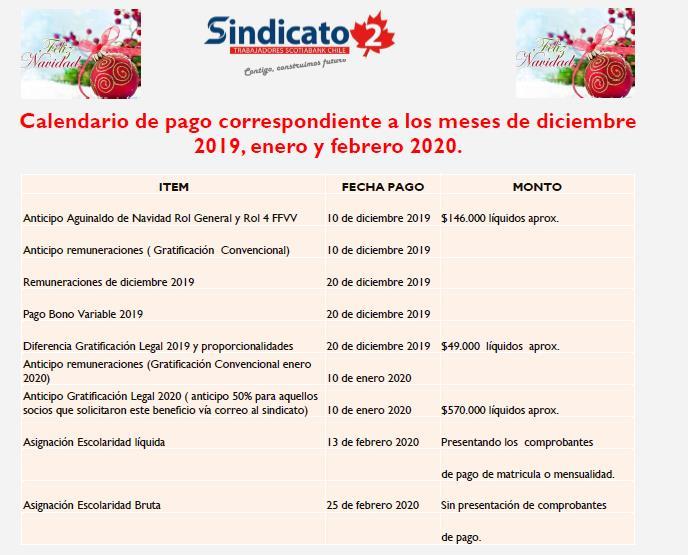El siguiente es el calendario de pago. Puedes bajar el archivo oficial del Sindicato de Trabajadores N°2 Scotiabank haciendo clic AQUI, o bien sobre la imagen a continuación: